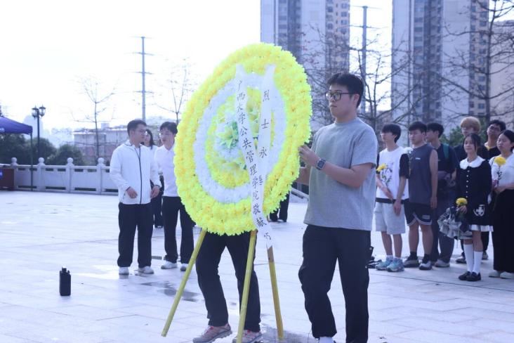 为缅怀革命先烈,弘扬爱国主义精神,增强学生的历史责任感与使命感,3月29日下午,我院于广西壮族自治区烈士陵园开展“缅怀先烈守初心,砥砺青春担使命”清明祭扫活动。院学工组辅导员陈科旭出席本次活动,2025级全体本科生及第三十四届共进连全体成员参与本次活动,全体师生庄重有序,向革命先烈致以崇高敬意与深切追思。